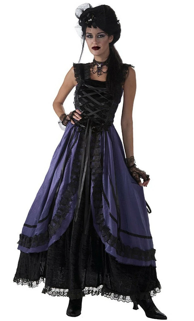 Flaunt your charming dark side in this stylish Purple Poison Gothic Dress Costume. The Purple Poison Gothic Dress Costume features a long black Gothic style dress with lace trimming along the skirt bottom with purple peplum overlay added with black lace trims, and lace up corset style sleeveless top with black lace trim and ribbon. The Purple Poison Gothic Dress Costume includes :
