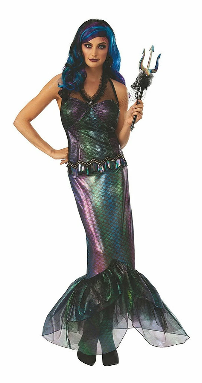 Not all mermaids love brightly coloured shells and pastel outfits. For a darker look, this Queen of the Dark Seas mermaid costume will be perfect! It features a shimmery dark purple, green, and blue halter top with scale detail, a matching mermaid skirt with shimmery tulle at the bottom to emulate fins, and a matching trident scepter so you can let everyone know who’s Queen around here! The top is also decorated with a metallic starfish and shiny tassels for a rich look. Complete it with a wig and crown (not included) and you’ll feel like mermaid royalty.