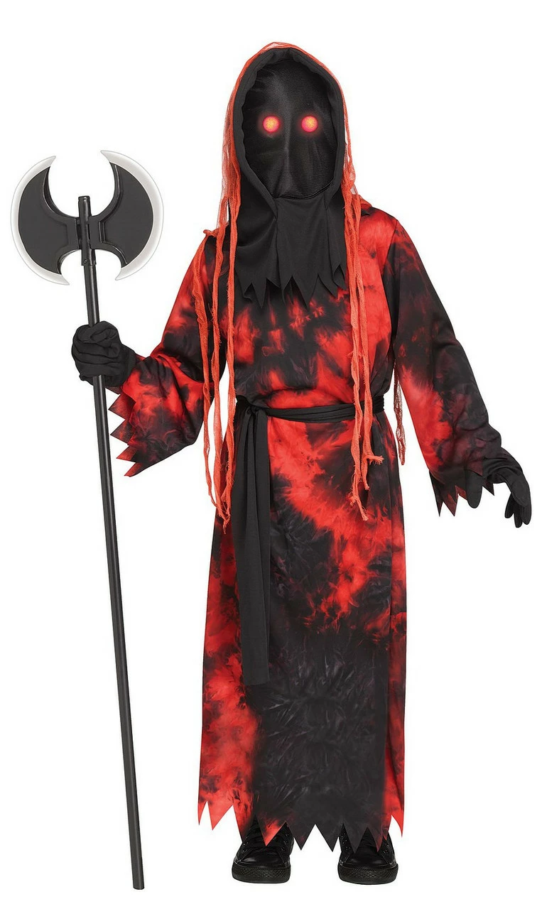 If your child is looking for a scary costume this Halloween, look no further than the Red Fade Eye Executioner Child costume. It features a spooky black and red robe with jagged trims, a hood with red tatters and a black mask, a black belt, glasses with a fade eye mechanism that will make it look like your child has two glowing red eyes that fade in and out, and black gloves.