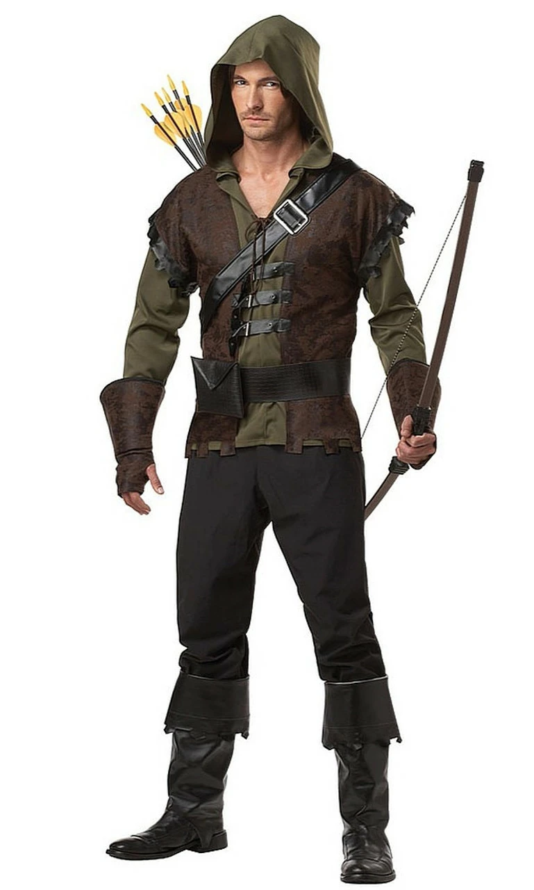 Turn into a legendary outlaw. Dress up in this handsome Robin Hood Costume and you’re on your way to another adventure where mischief and charity meet! This Robin Hood Costume features a hooded dark olive green shirt with attached brown vest, matching gauntlets, a wide belt with pouch, and a pair of sturdy black boot covers. Come out with your Merry Men or pair up with Maid Marian for that perfect character portrayal!