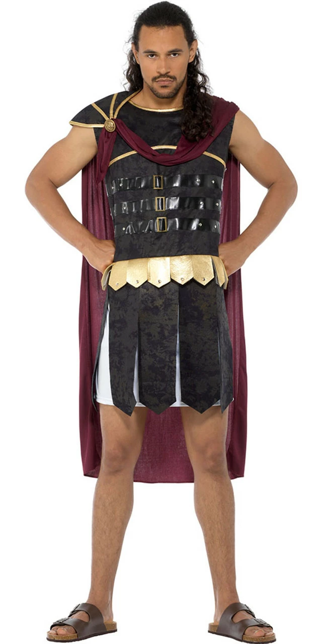 Immerse yourself in Rome’s rich history in this Roman Warrior Men Costume! Fight battles in the Coliseum in this costume consisting of a black tunic with gold trim and flaps by the skirted area. The tunic also consist of various belting across the chest and a gold belt around the waist. Additionally, this powerful costume includes a burgundy cape for a truly mighty look.Â