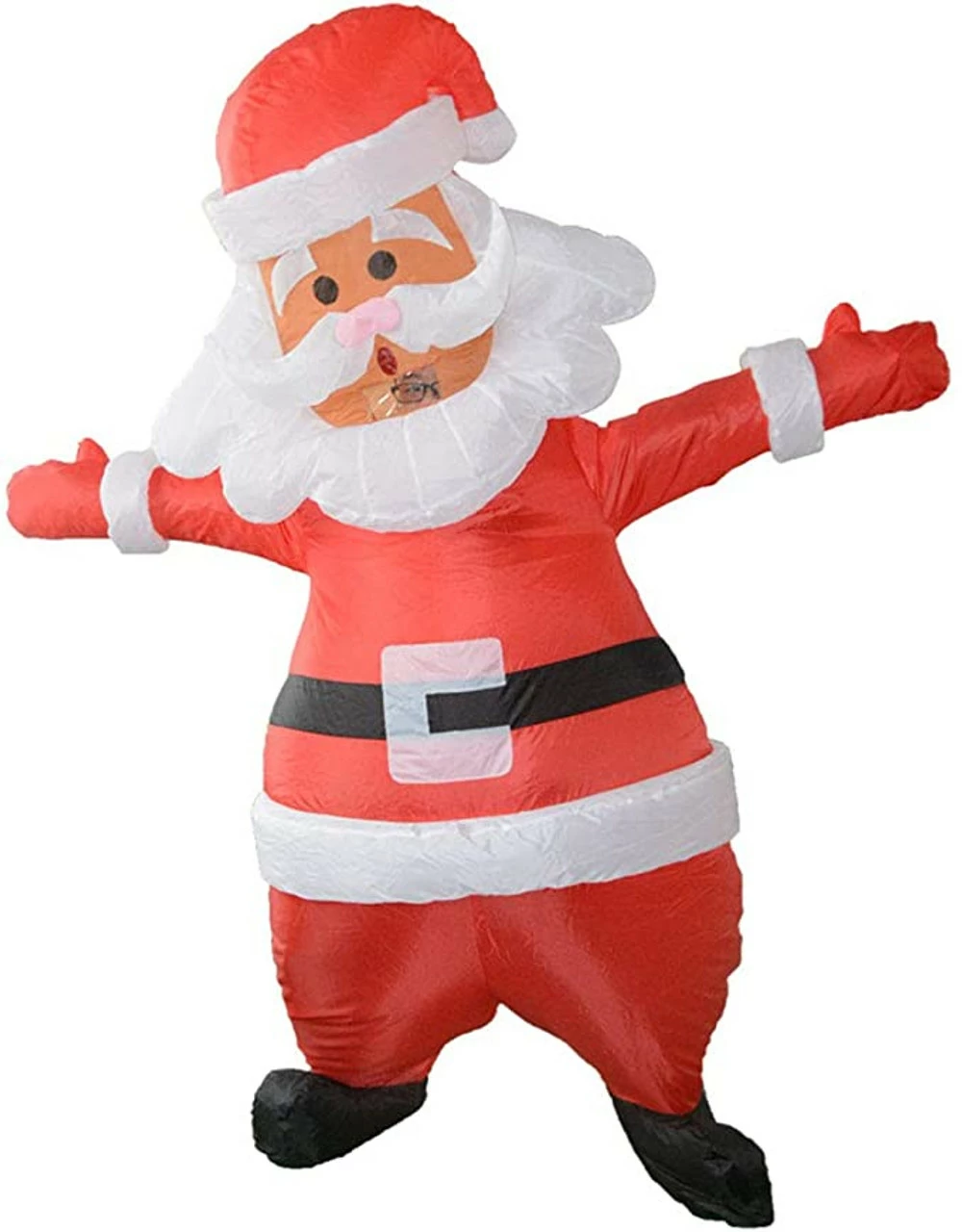 Why not be Jolly Old St. Nicholas? You can be the jolliest Santa Claus there is! Santa Claus Inflatable Men Costume features a big inflated classic Santa Claus with white hair and a beard. A classic red suit and hat with white accents. The black belt and boots complete the look. The transparent window is located in the chin of Santa’s Jolly face located at the perfect height to be able to see where you’re going. This inflatable costume also includes a usb fan with battery pack to keep the costume inflated.