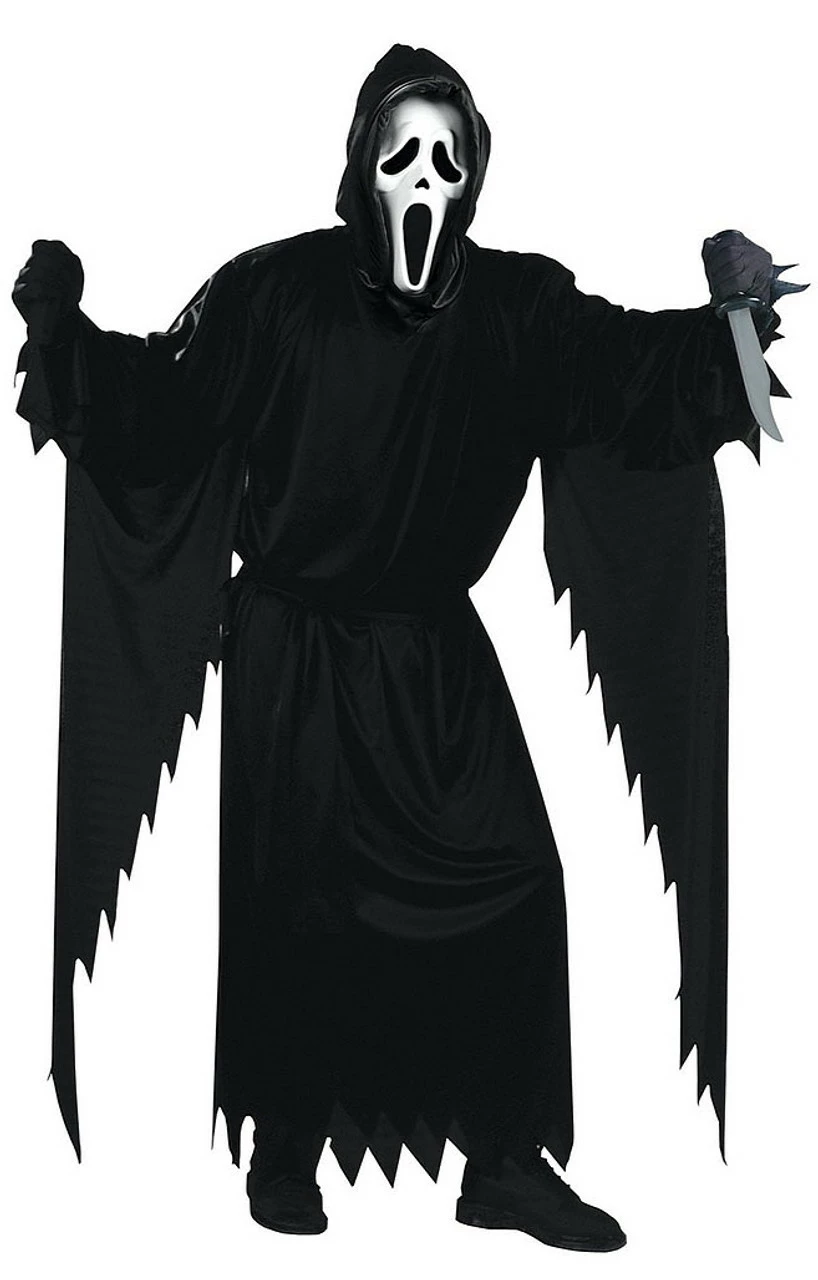 Make everyone at the party scream with fear in this Scream Ghost Face Adult Costume! This creepy movie-inspired ensemble features a long, hooded black robe with drape sleeves, jagged edge sleeves and hem, a matching waist belt and a signature Scream face mask. Pair this with a toy knife and gloves and everyone will run in terror when your start walking along the party hall! Fits Up To 6’/200 lbs