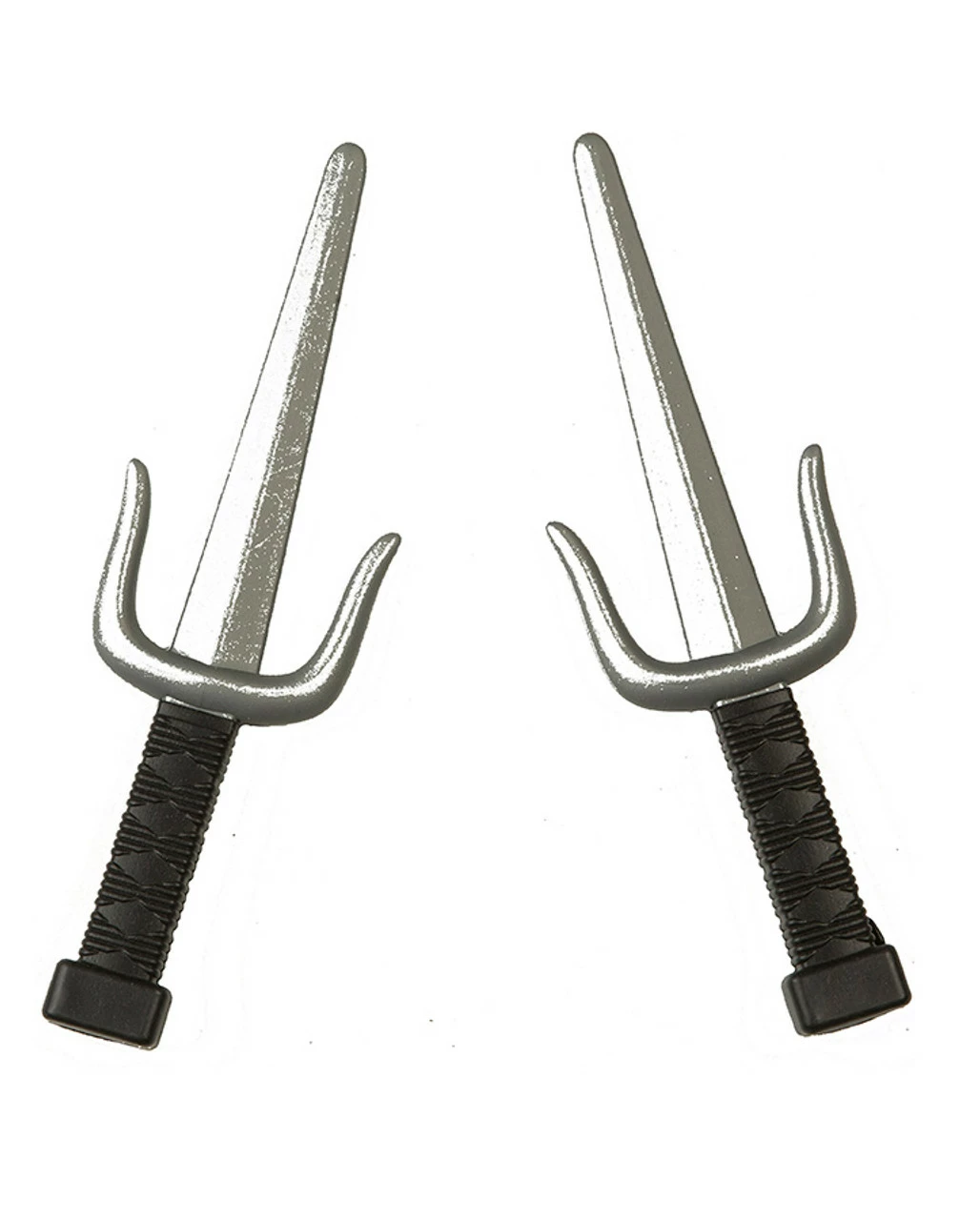 Surprise your opponents by whipping out these Small Ninja Sais. This prop is perfect for your next TMNT costume! Dress up as Raphael and show off your skills this Halloween! Small Ninja Sais features two Sais with a black handle and three silver spikes on each Sais. This prop measures at 25 cm long.