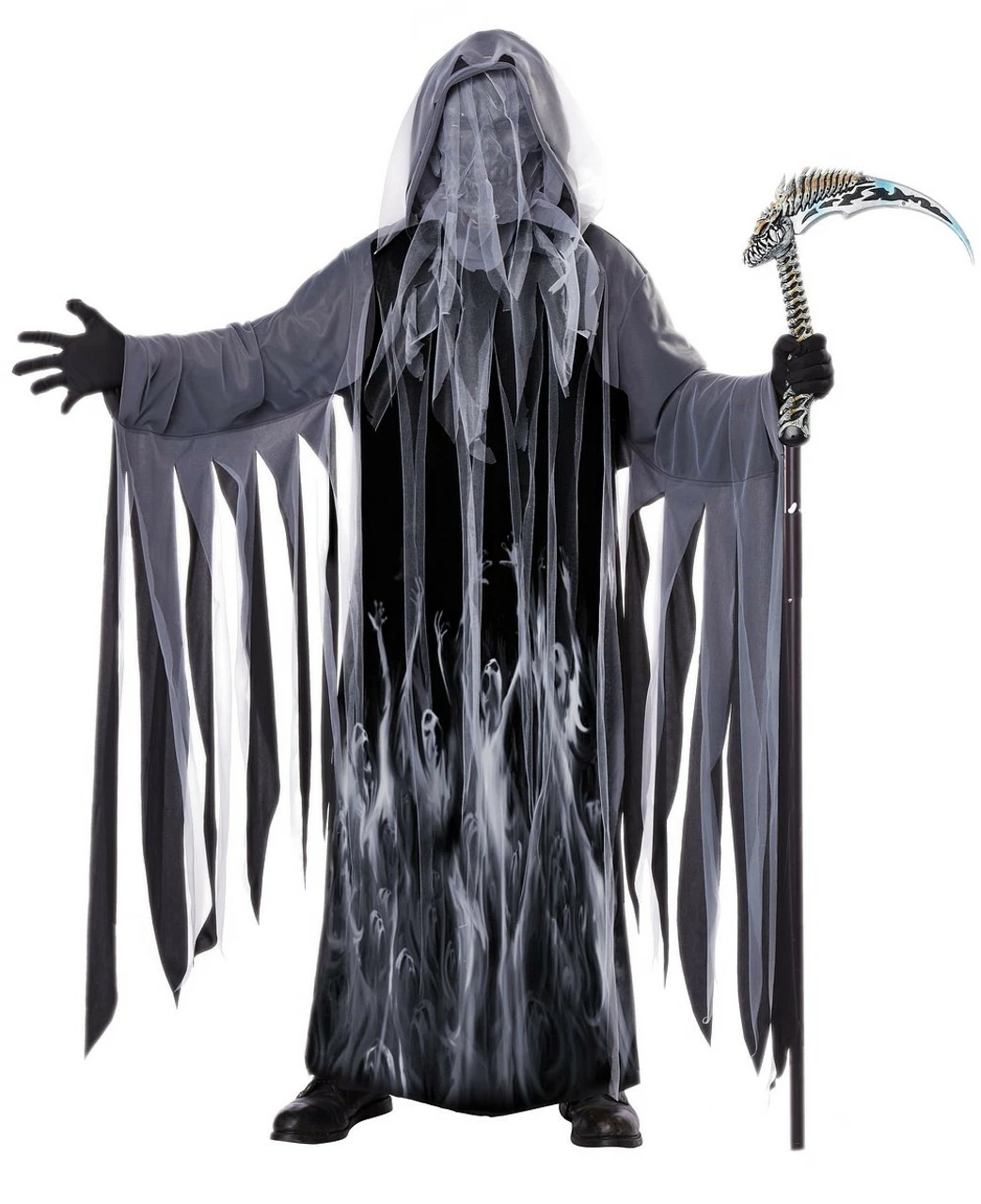 Be the most chilling creature this Halloween with this Soul Taker Reaper Adult Costume! Featuring a long, black robe with images of struggling souls printed on it, this outfit is sure to give your friends the biggest scare this Halloween. With its extra shreds of fabric that hang flowingly along the sleeves, as well as the attached hood and included mask, this Soul Taker Reaper Adult Costume makes a truly perfect costume for Halloween. Get this now and you’ll be taking unfortunate souls in no time.