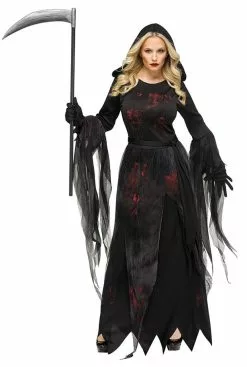 You don’t need to be soulless to wear this costume! The Soulless Reaper Women Costume features a black tattered looking dress with an attached hood, blood splatted detailing and black gloves to complete the look.
