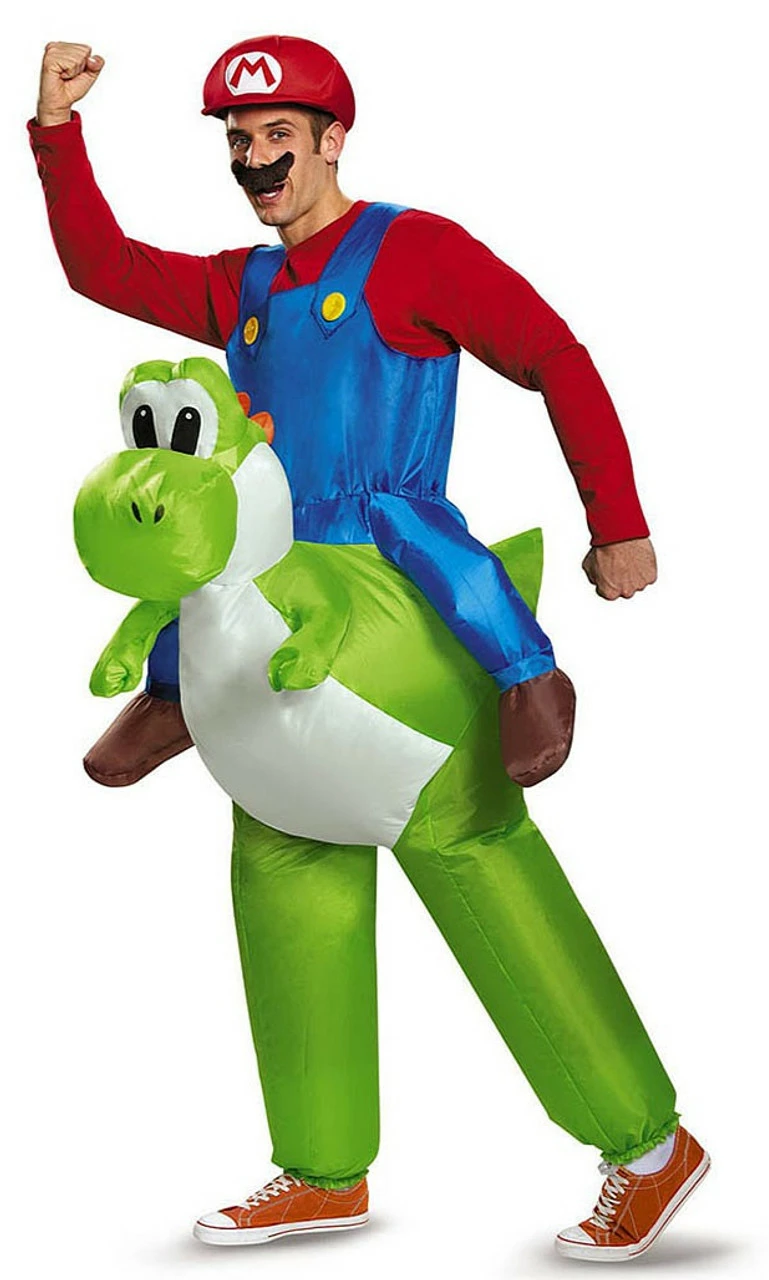 Become both your favorite Super Mario characters in this hilarious Mario Riding Yoshi costume. The inflatable short legs give you hilarious silly little Mario look. Watch out for bananas, Yoshi! Shirt, mustache, hat and batteries not included. Requires 4 “AA” batteries.