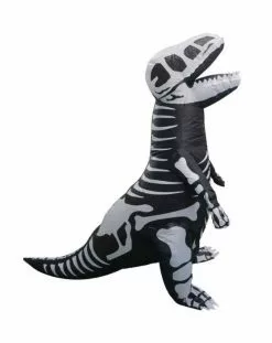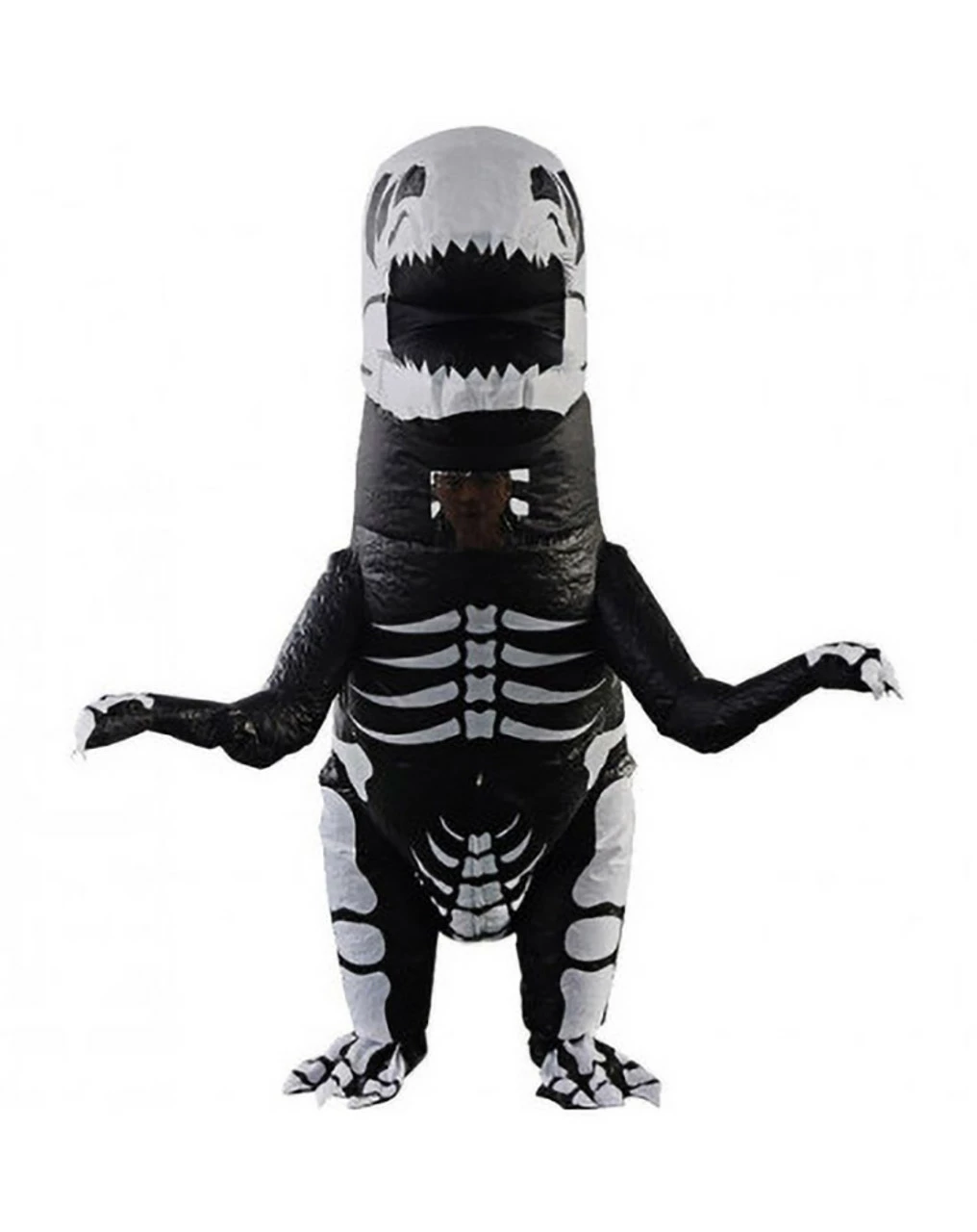 Do you want to be a t-rex for Halloween but not just any t-rex? A t-rex with a spooky twist? This costume is perfect for you! You will get a laugh and a fright out of your friends. The T-Rex Skeleton Inflatable Adult Costume features a black inflatable t-rex costume with a white skeleton design all over. You’ll be able to see where you’re going through the transparent window located on the neck of the dinosaur. This costume is complete with skeleton tail, feet and hands and also includes a usb fan with battery pack to keep the costume inflated.Â
