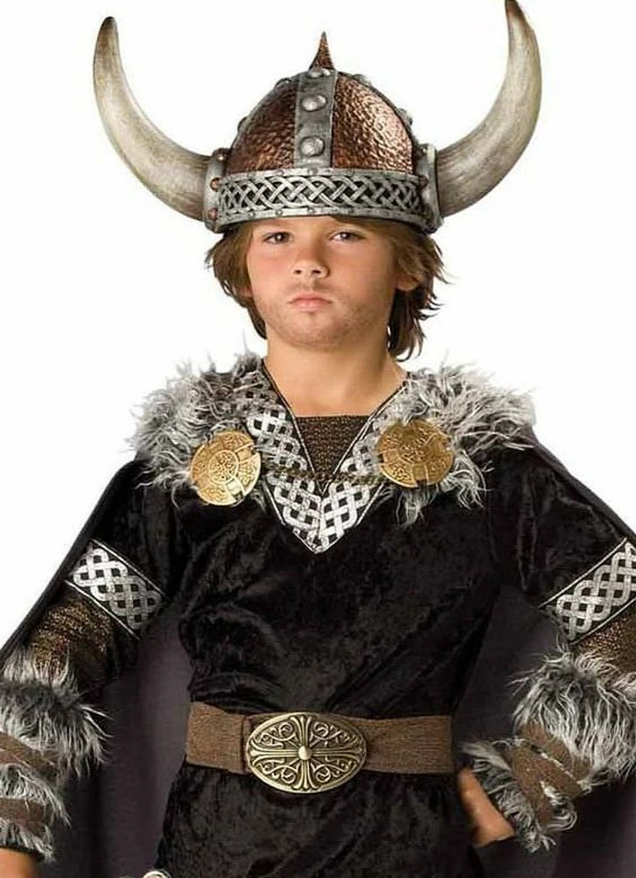 Your little one will certainly look the part of a fierce legend dressed in this Viking Warrior Kids Costume. Its velvety tunic with gold and silver accents and its matching pants give the appearance of tanned leather.. The long sleeves with the faux fur, the belt and faux fur boot covers and cape with a faux fur trim anchor the tough unconquered look. Top it off with his seafaring hat adorned with horns and he’ll be ready to raid and discover unchartered candy in no time!Ā