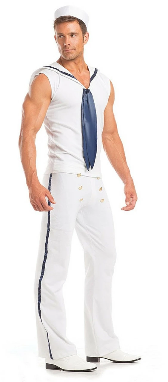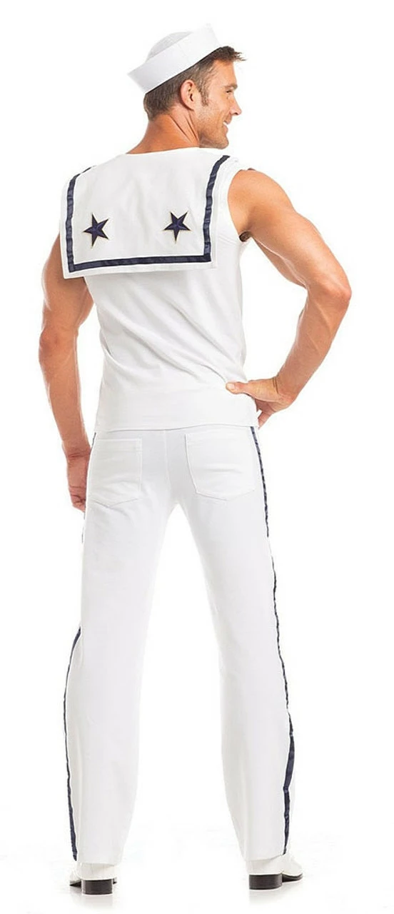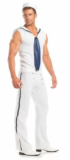 A fresh and neat sailing style! This Sexy Sailor Men’s Costume is very invigorating with white sailor sleeveless top accentuated with a blue and white sailor collar decorated with two stars, a blue tie and matching crisp white pants with gold buttons an a blue stripe down each side.