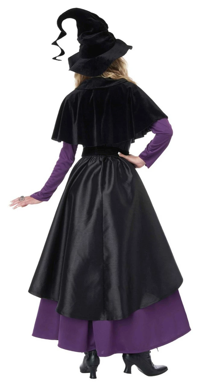 Be a wicked witch while making a fashion statement this Halloween! Cast your spell and prepare your potion in style while wearing this stylish look. The Witch’s Coven Woman Costume features a purple dress, a black cape with front buttons. The gorgeous zig-zag black hat and the belt complete the witch look. Don’t forget to add the broom to fly away at the end of the party!​