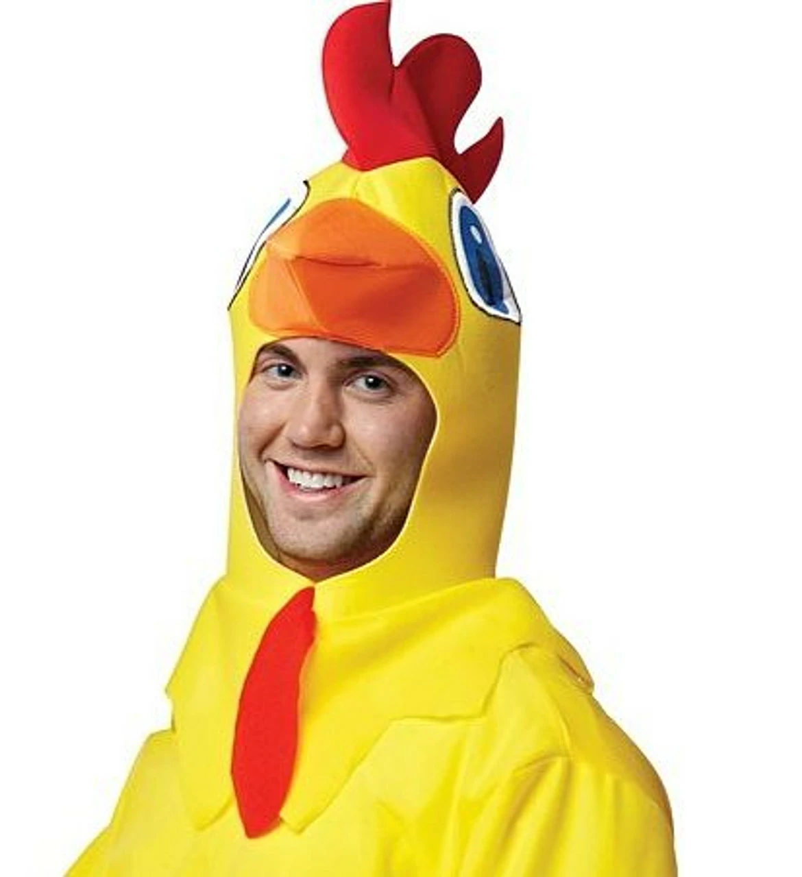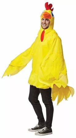Bawk! Bawk! It’s going to be a night full of hip and offbeat fun! The easy and fun Yellow Chicken Adult Costume features a yellow tunic with wing sleeves, attached tail and and a matching hood with funny chicken face details. This costume is for both women and man and make a fun couple costume.